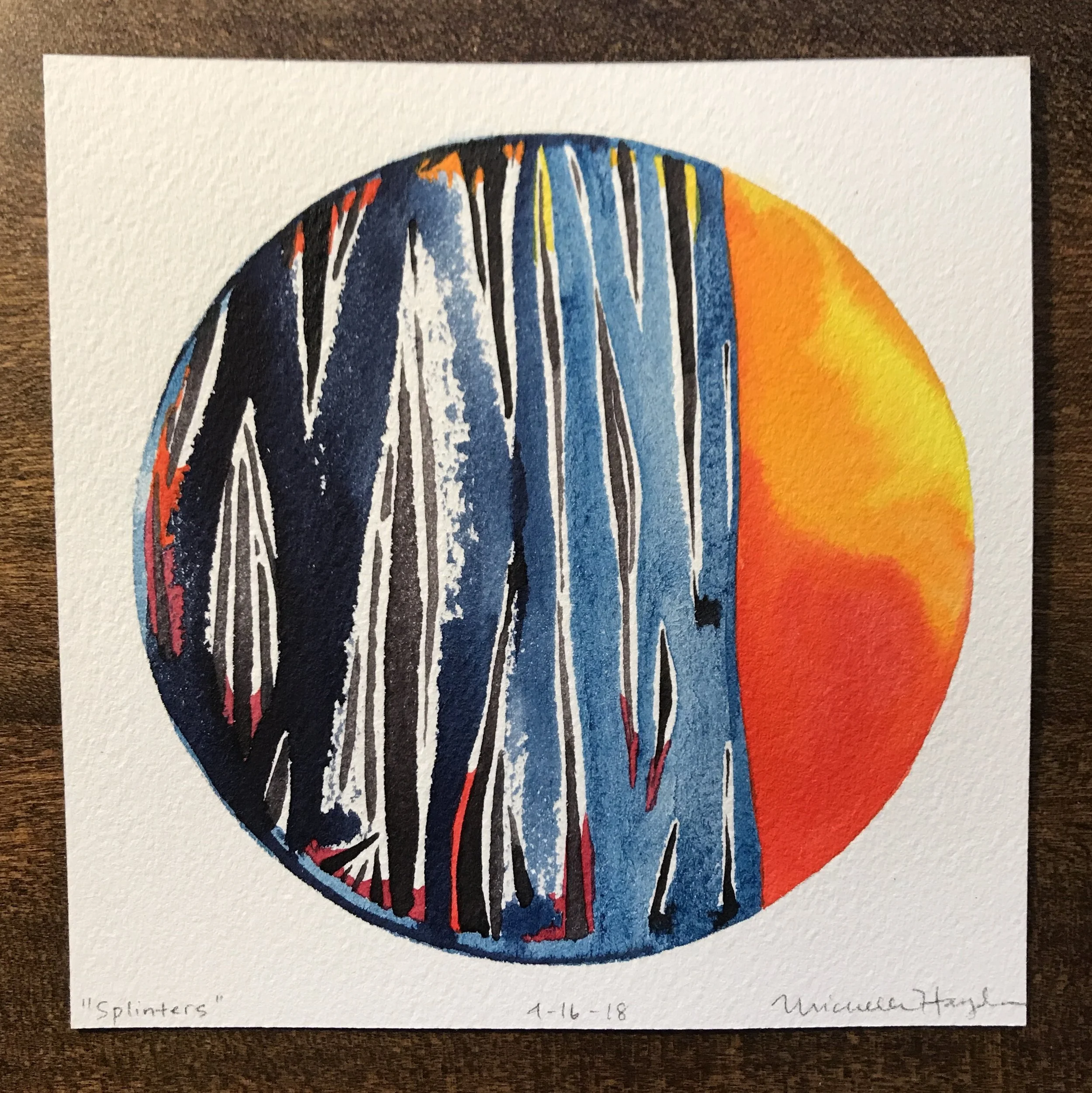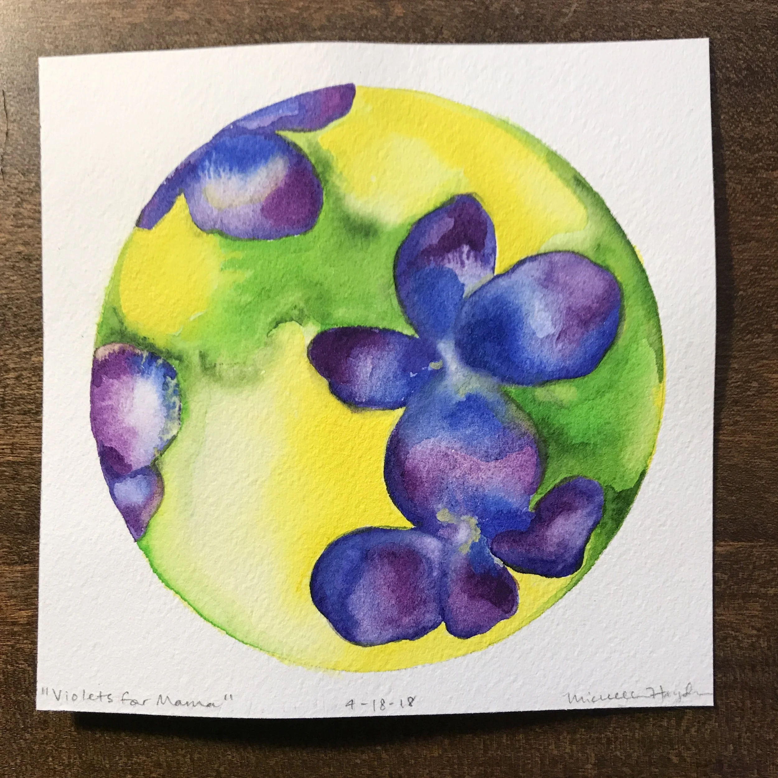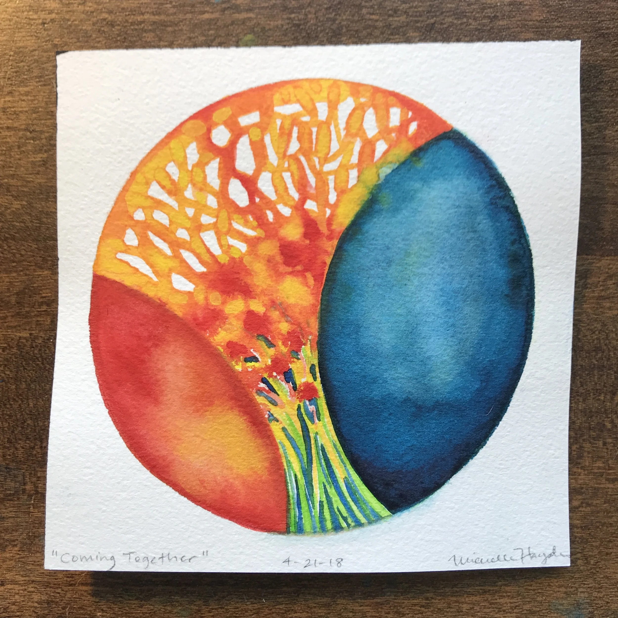 ("This morning I crawled out of bed after little sleep, working on a deadline that is using up serious brain power :). I was curious how the circle would go, and was not so surprised when the pigment flowed outside the lines, despite trying to be careful. How easy it is to want to fix it, hide it, start again, rather than just let it be as it is... My youngest and I were discussing this very thing last night— how good it is to be gentle with ourselves and keep things in perspective when we make “mistakes”, fostering space to grow, learn, and accept that we are human. Certainly with paint, it does not matter a bit, but the practice of being mindful of how we speak to ourselves is one which needs at least as much attention as what goes into the daily watercolor circle. May we all go tenderly today...")