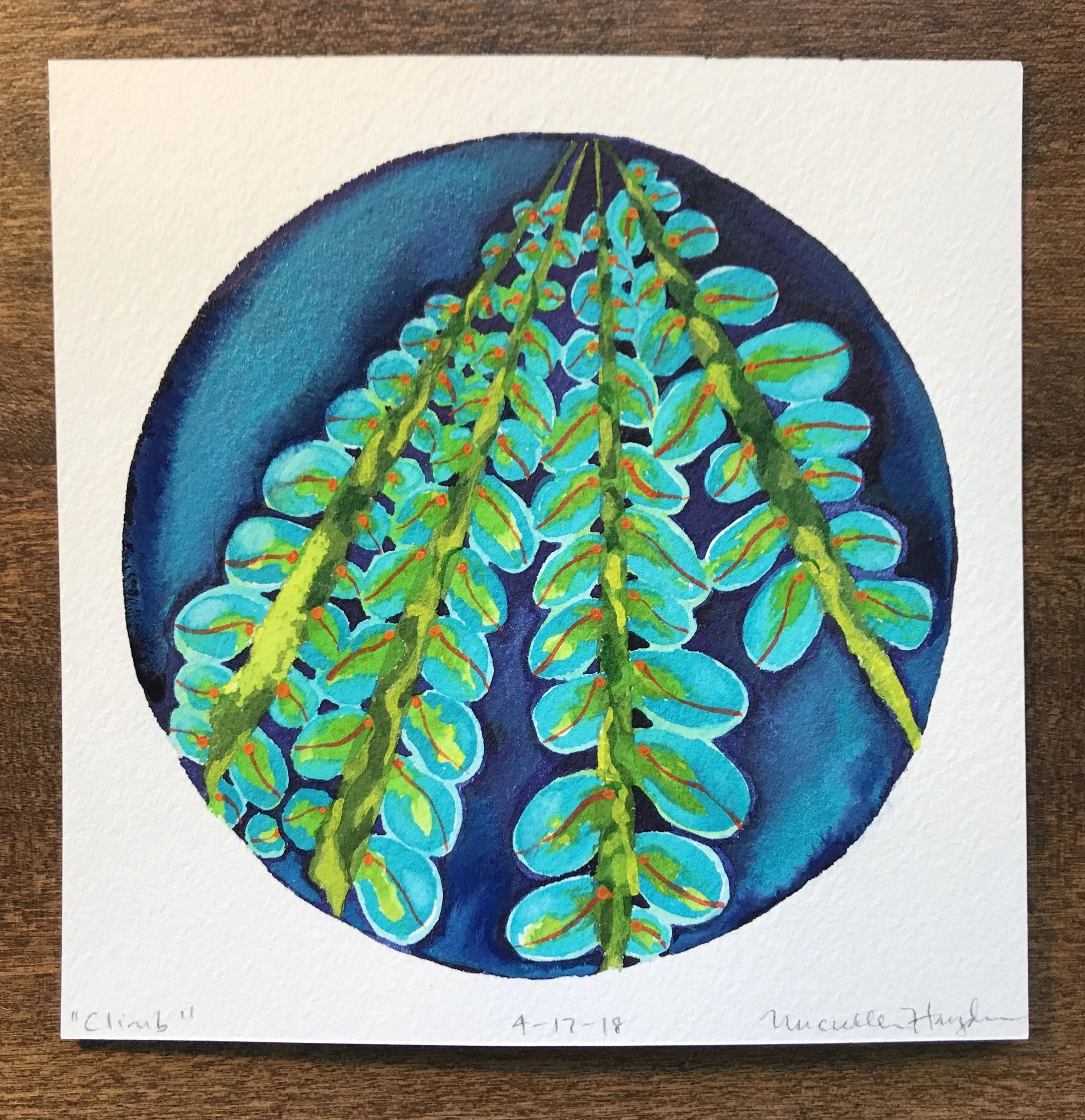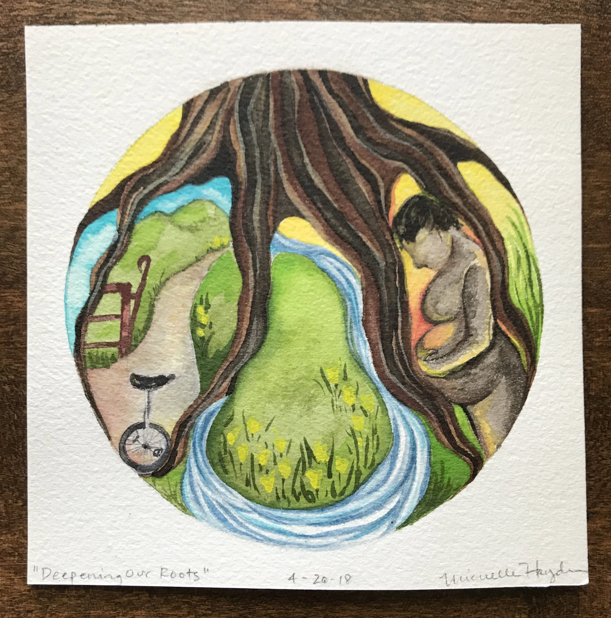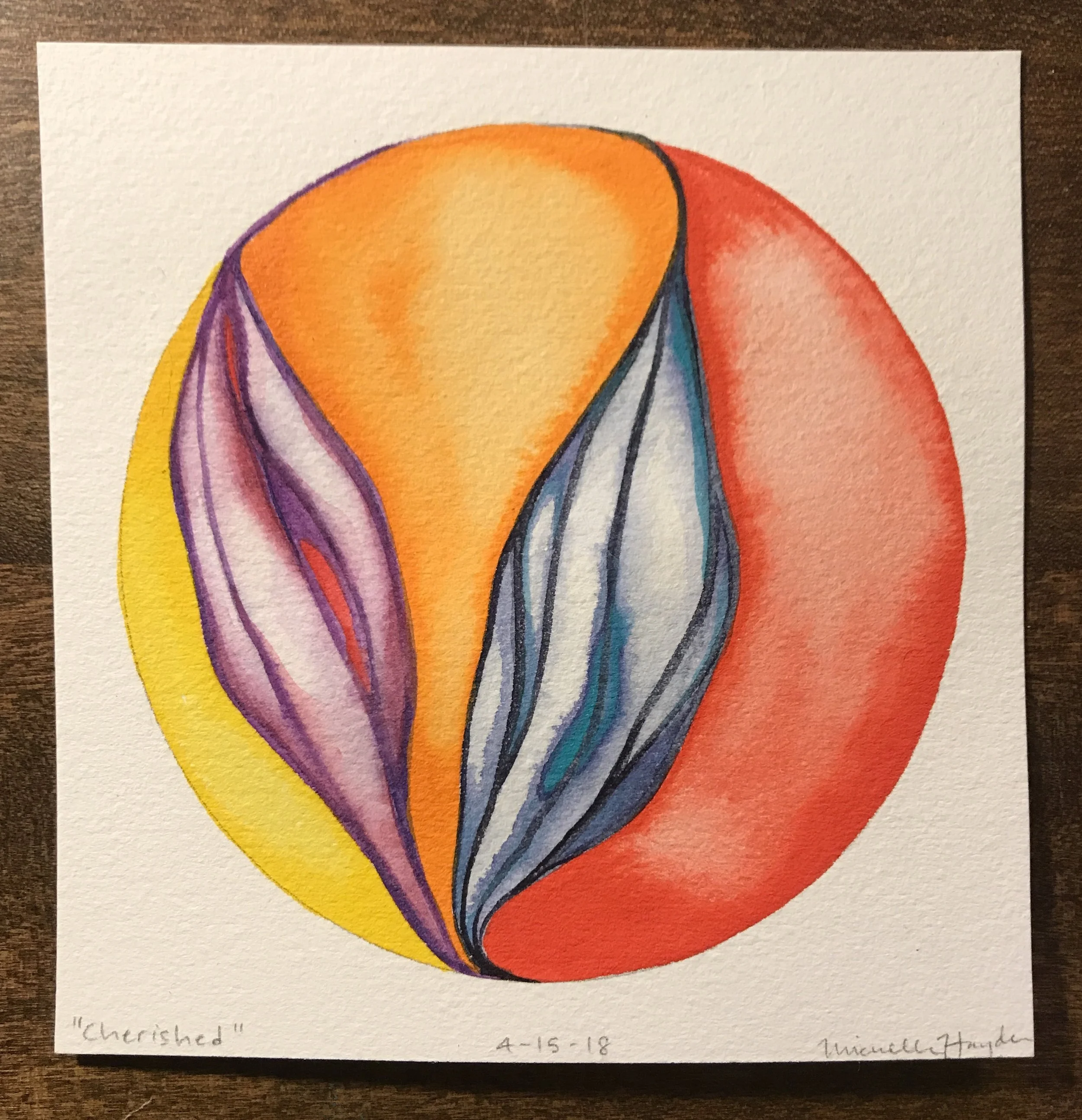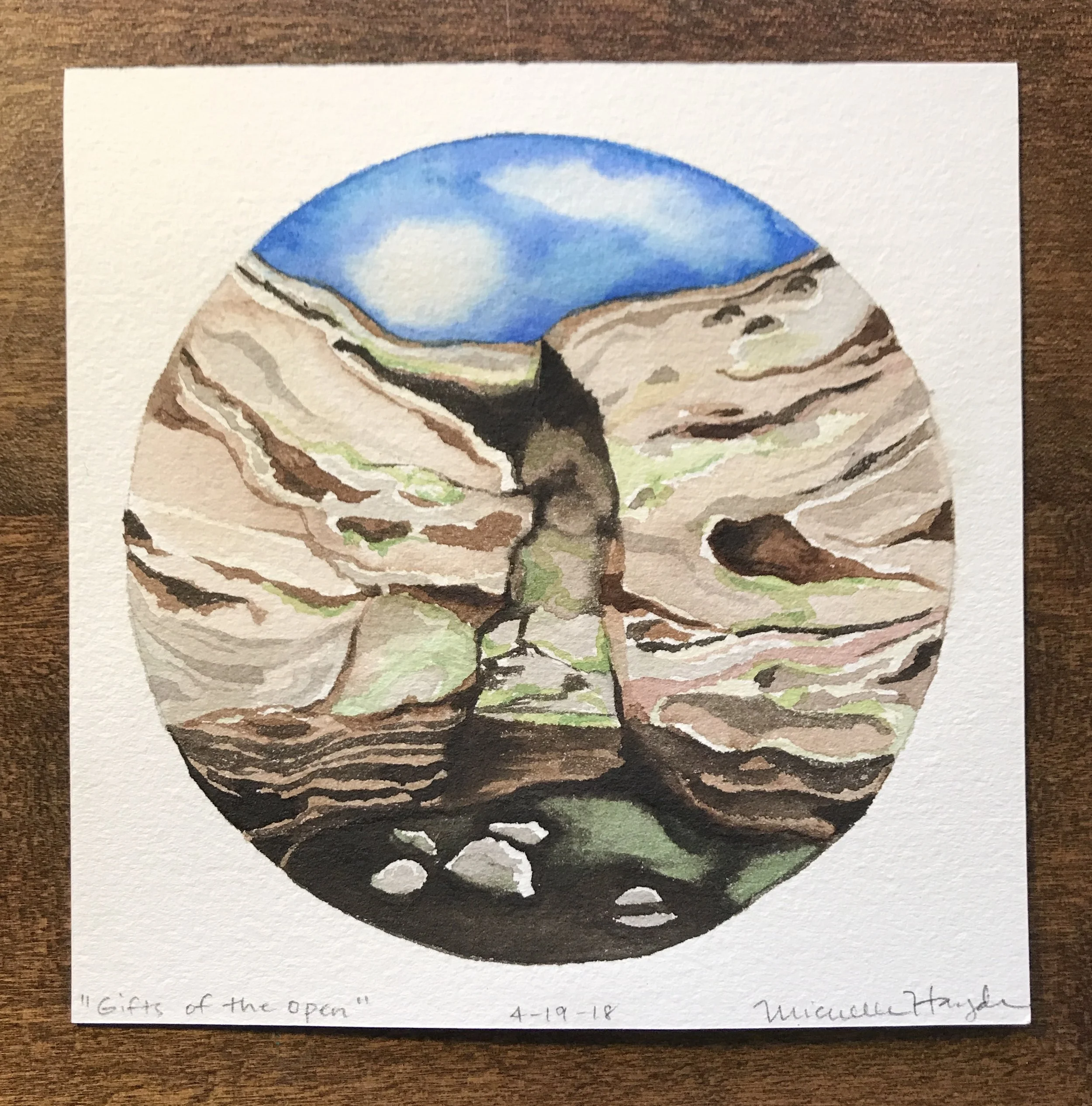 ("This morning I crawled out of bed after little sleep, working on a deadline that is using up serious brain power :). I was curious how the circle would go, and was not so surprised when the pigment flowed outside the lines, despite trying to be careful. How easy it is to want to fix it, hide it, start again, rather than just let it be as it is... My youngest and I were discussing this very thing last night— how good it is to be gentle with ourselves and keep things in perspective when we make “mistakes”, fostering space to grow, learn, and accept that we are human. Certainly with paint, it does not matter a bit, but the practice of being mindful of how we speak to ourselves is one which needs at least as much attention as what goes into the daily watercolor circle. May we all go tenderly today...")